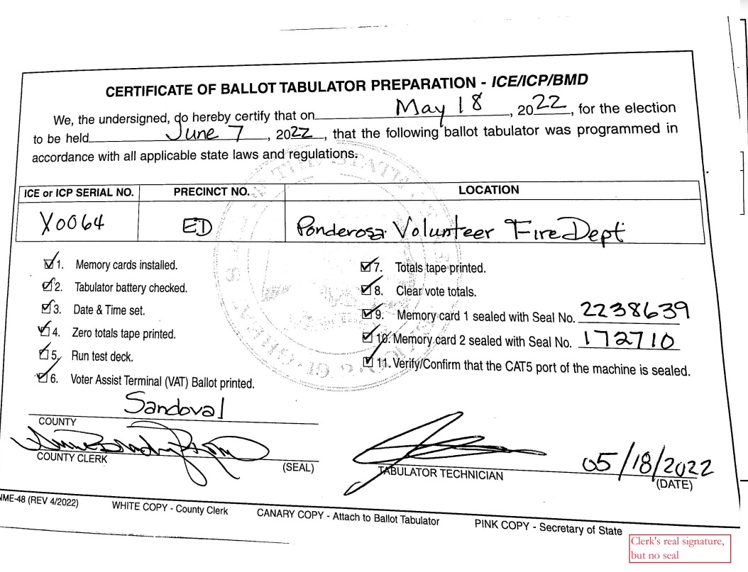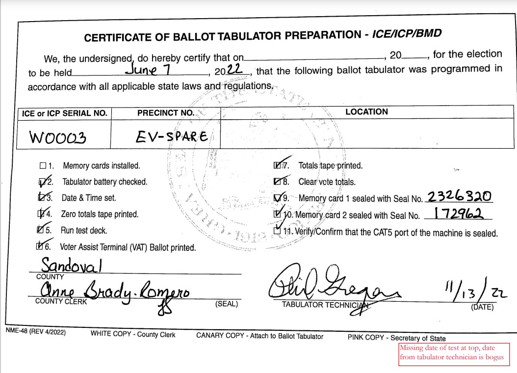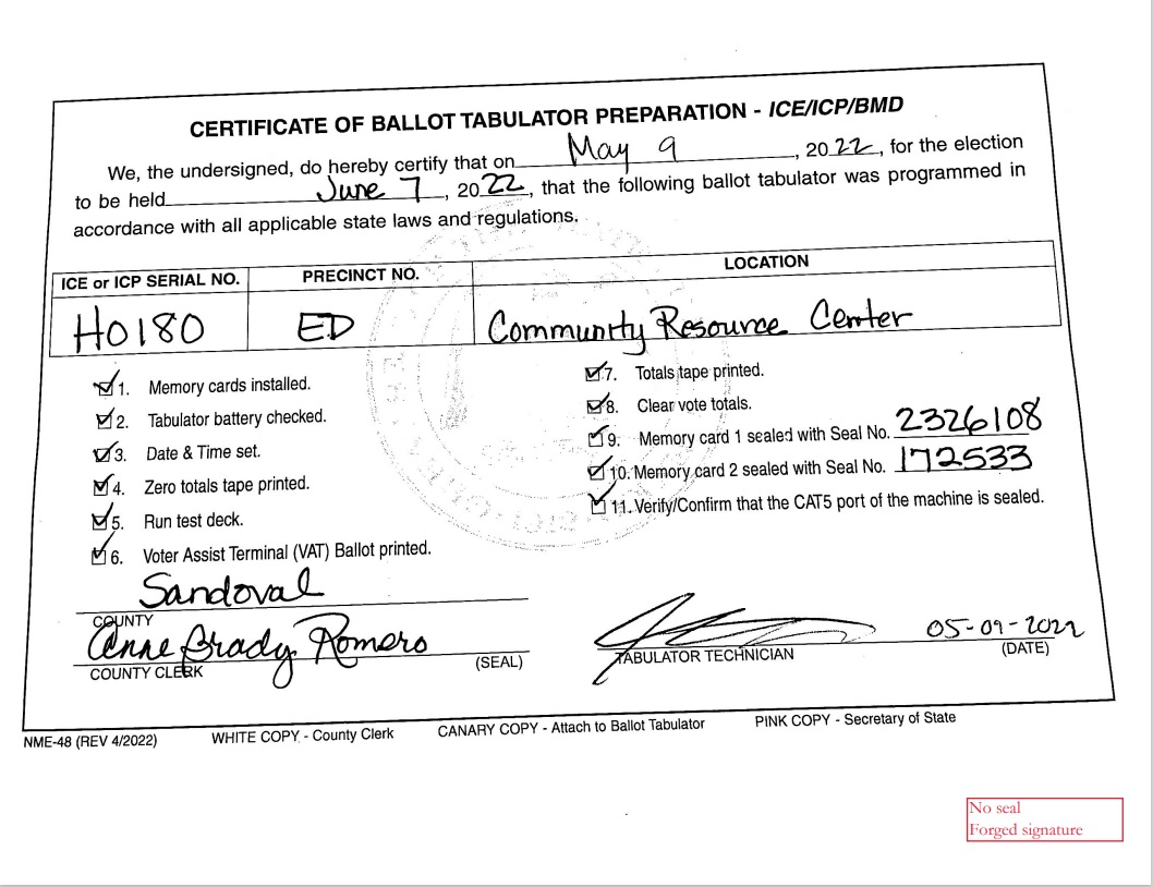 There was NO county clerk seal on any of the 133 certificates, 50 certificates were without a completion date, one had a tabulator technician signature dated November 13, 2022, the clerk did not sign 132 of the certificates, at least 3 different people signed her signature on 131 of the certificates. It appears that tabulator ICE #H0180’s certificate was forged, and a criminal complaint has been filed with the county sheriff’s office. Copies of the certificates and a copy of the ethics complaint that was filed with the SOS office and Ethics Board in Sandoval County were provided for the Sheriff. The sheriff’s case number is 22-001136.