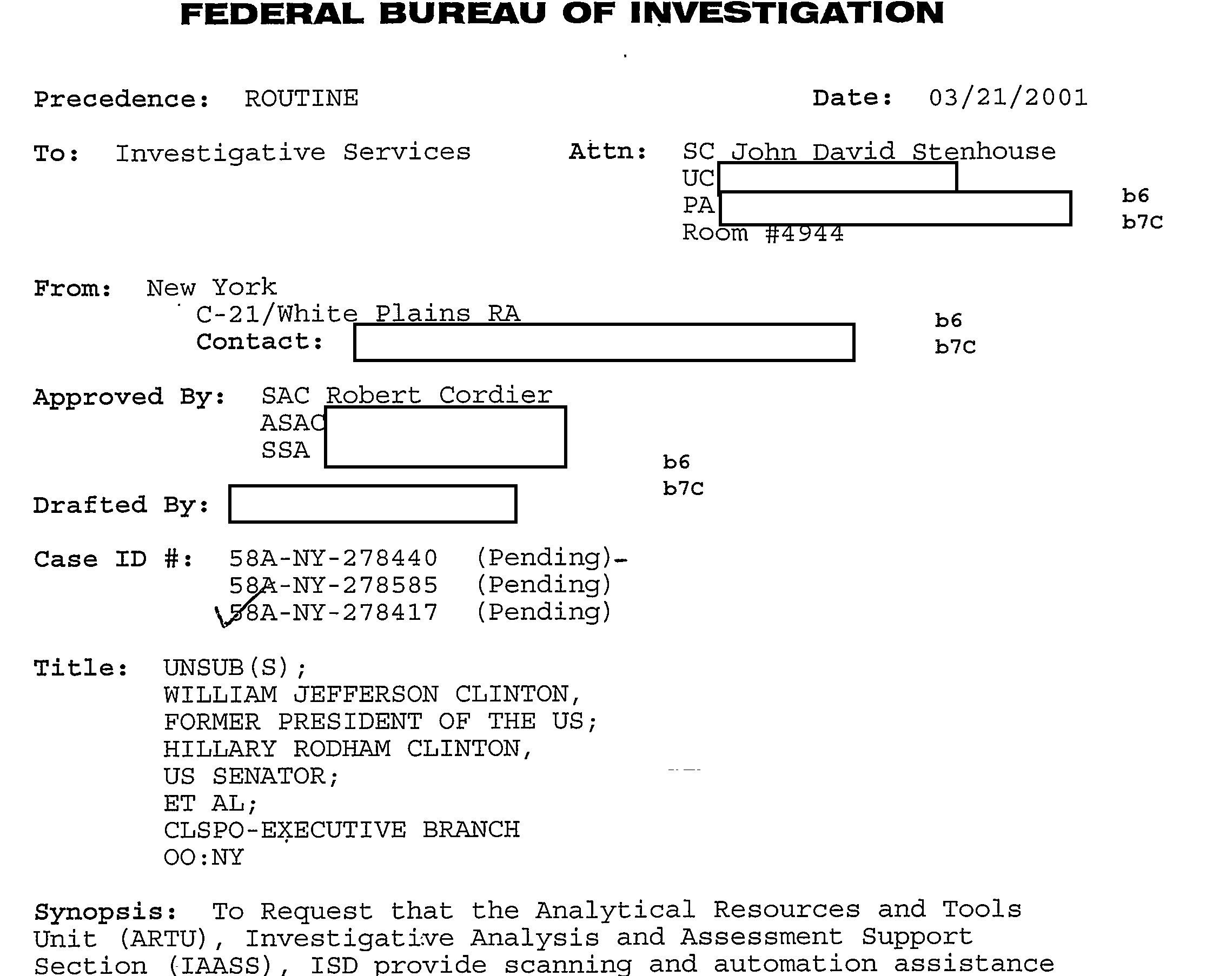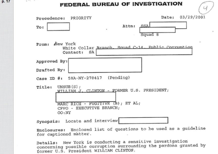 But another document provided shows either incompetence or another FBI coverup or both. On page 17 of the document dump, the FBI releases a document dated in 2001 related to a dinner meeting with Bill Clinton and Hillary Clinton and others. The FBI was supposedly looking into whether Clinton’s pardons of individuals like Marc Rich, were on the up and up.