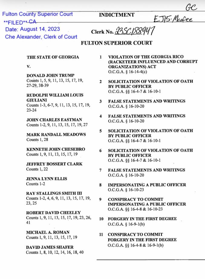 The indictment unsealed Monday night was identical to the leaked charging docs posted to the Fulton County clerk’s website.