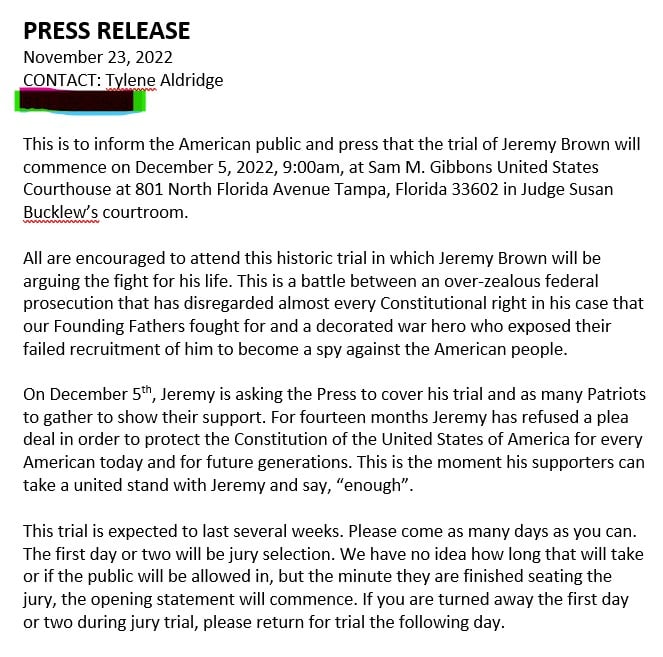 813-XXX-XXXXThis is to inform the American public and press that the trial of Jeremy Brown will commence on December 5, 2022, 9:00am, at Sam M. Gibbons United States Courthouse at 801 North Florida Avenue Tampa, Florida 33602 in Judge Susan Bucklew’s courtroom.