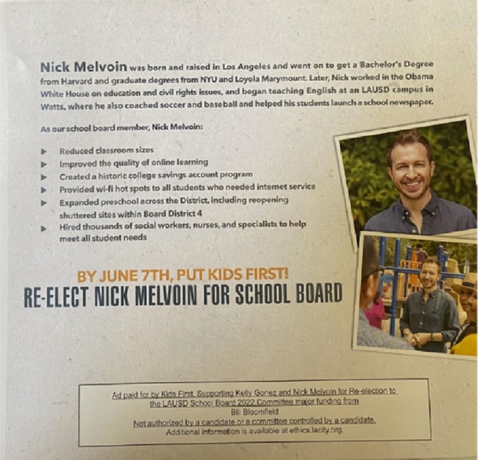 “Nick Melvoin is committed to protecting the most vulnerable students” and is “focused on making the district more transparent and accountable,” the brochure states.
