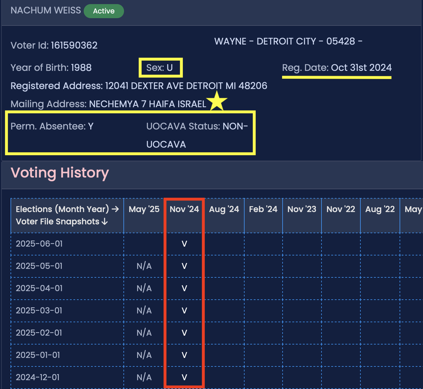Here’s where it get even more outrageous—EVERY SINGLE one of the 13 registered voters that used Israeli addresses to register to vote (3 of whom cast votes in the 2024 election), have ALL now flipped to “Permanent Absentee Voter” “Non-UOCAVA” voter status in the state of Michigan, yet their Israel addresses remain on the voter rolls. Federal UOCAVA law states that non-military overseas voters MUST re-register to vote each election year. In order for these 13 so-called voters to become permanent absentee voters, they would have had to all move back to the coffee shop and re-register to vote, as permanent absentee voters in Michigan, but since their Israeli addresses appear on the voter rolls and there are no updates to their Israeli mailing addresses, it doesn’t appear they ever re-registered. So, how did these 13 registered voters suddenly go from having mailing addresses in Israel to becoming “permanent absentee voters” in Michigan?