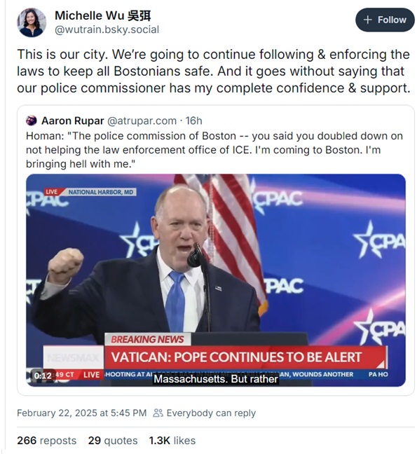 Far-left Boston Mayor Michelle Wu responded to Homan’s comments in a post on BlueSky — an X ripoff for liberals.