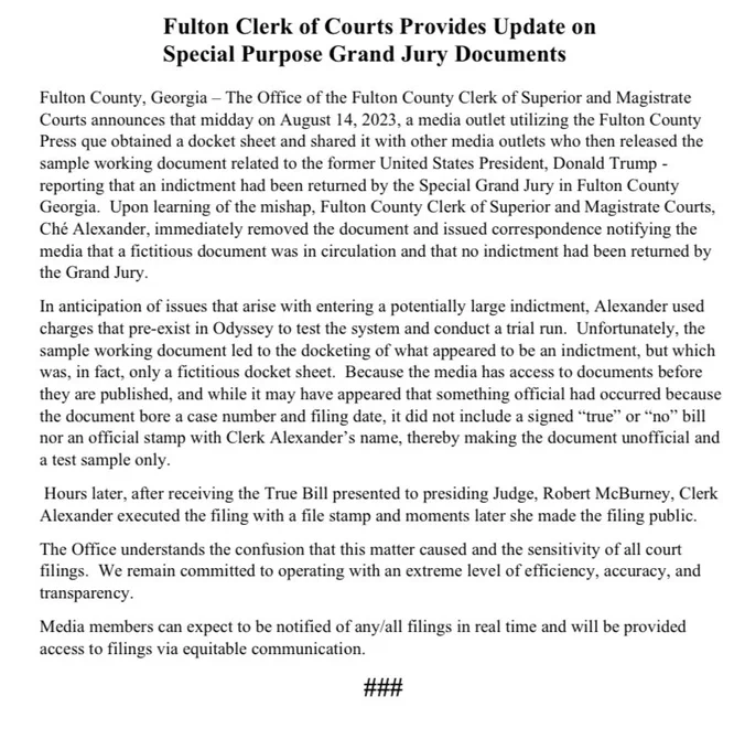 “In anticipation of issues that arise with entering a potentially large indictment, Alexander used charges that pre-exist in Odyssey to test the system and conduct a trial run. Unfortunately, the sample working document led to the docketing of what appeared to be an indictment, but which was, in fact, only a fictitious docket sheet,” the Fulton Clerk of Courts said in a Tuesday statement.